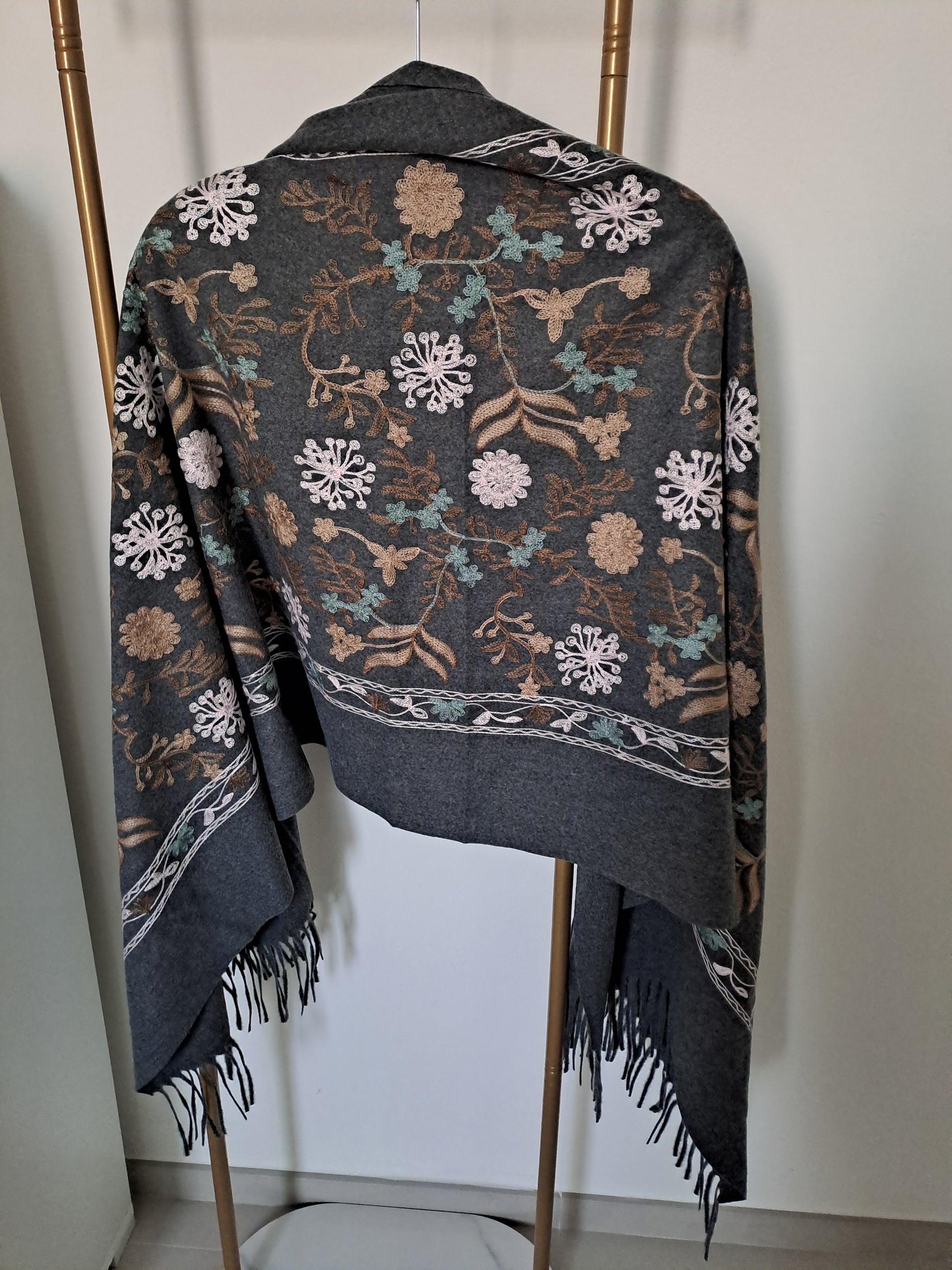 Morbidissima sciarpa in cashmere con frange, disponibile in 4 colori. Ricami floreali.