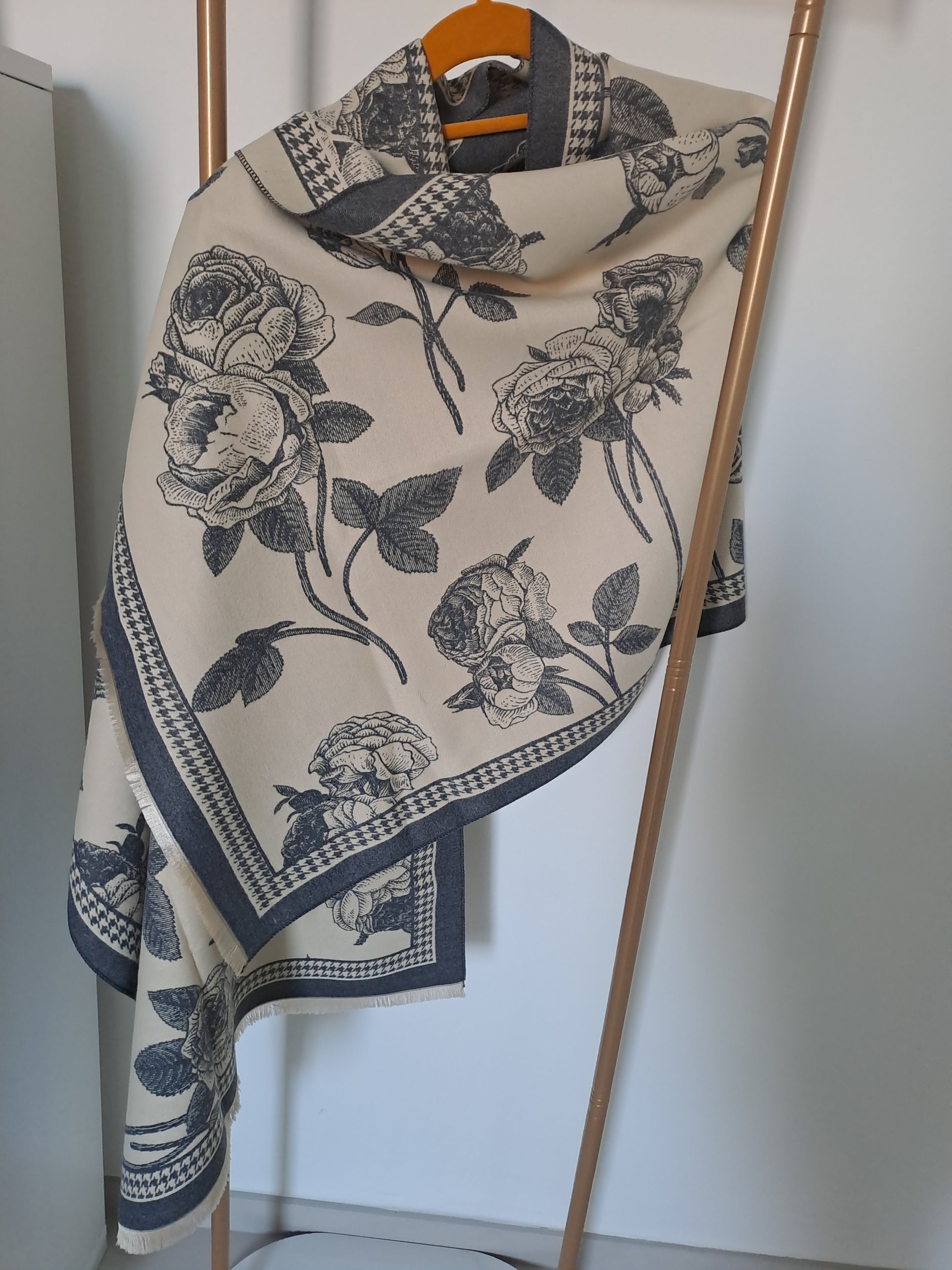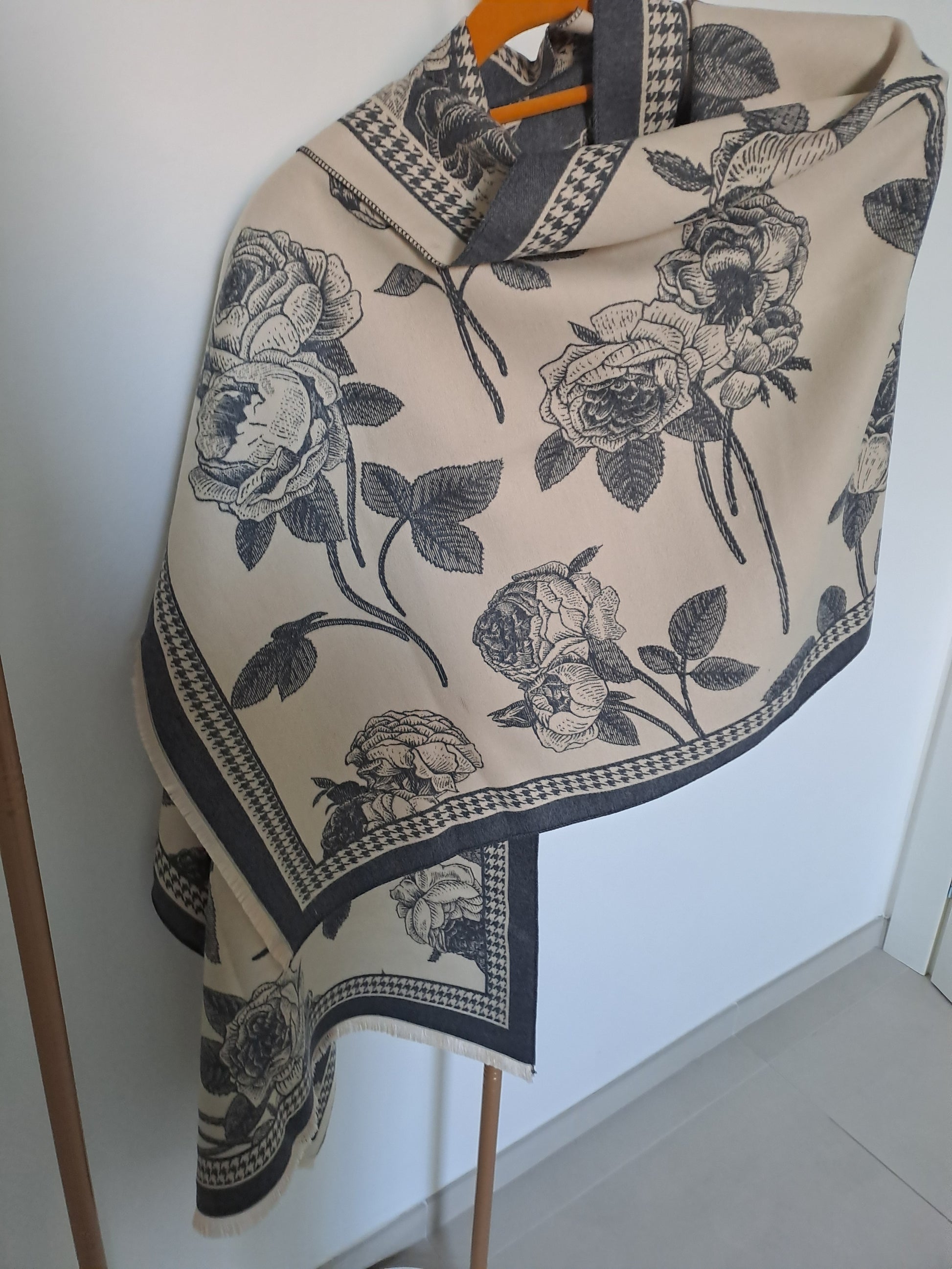 Sciarpa fantasia fiori e bordi pied de poule. Cm 188x65. Poliestere
